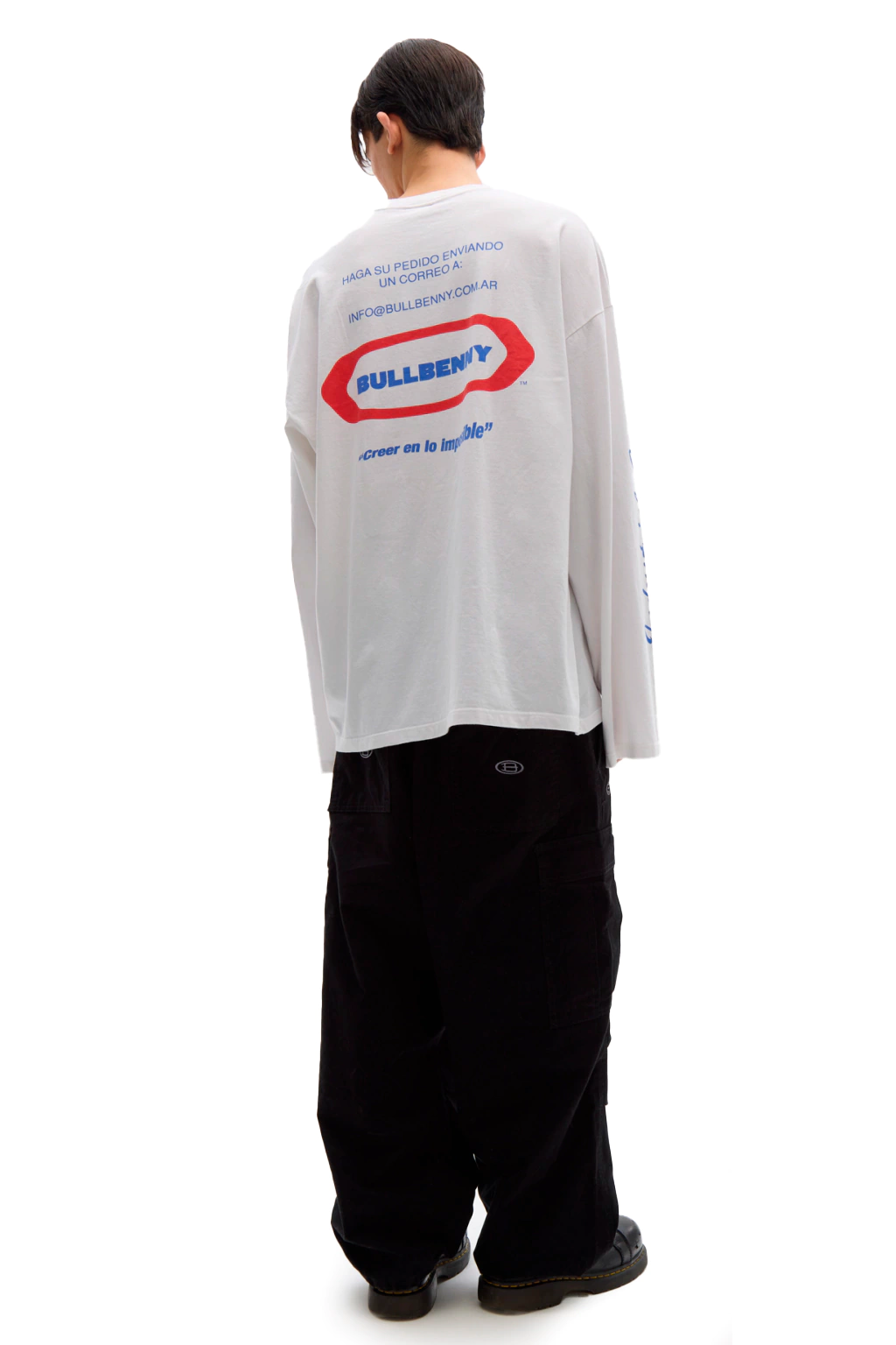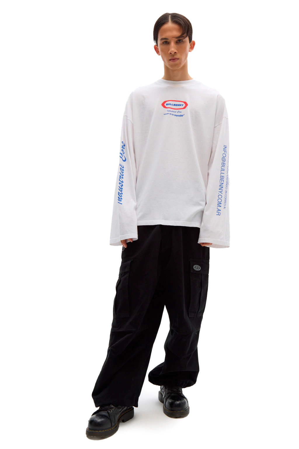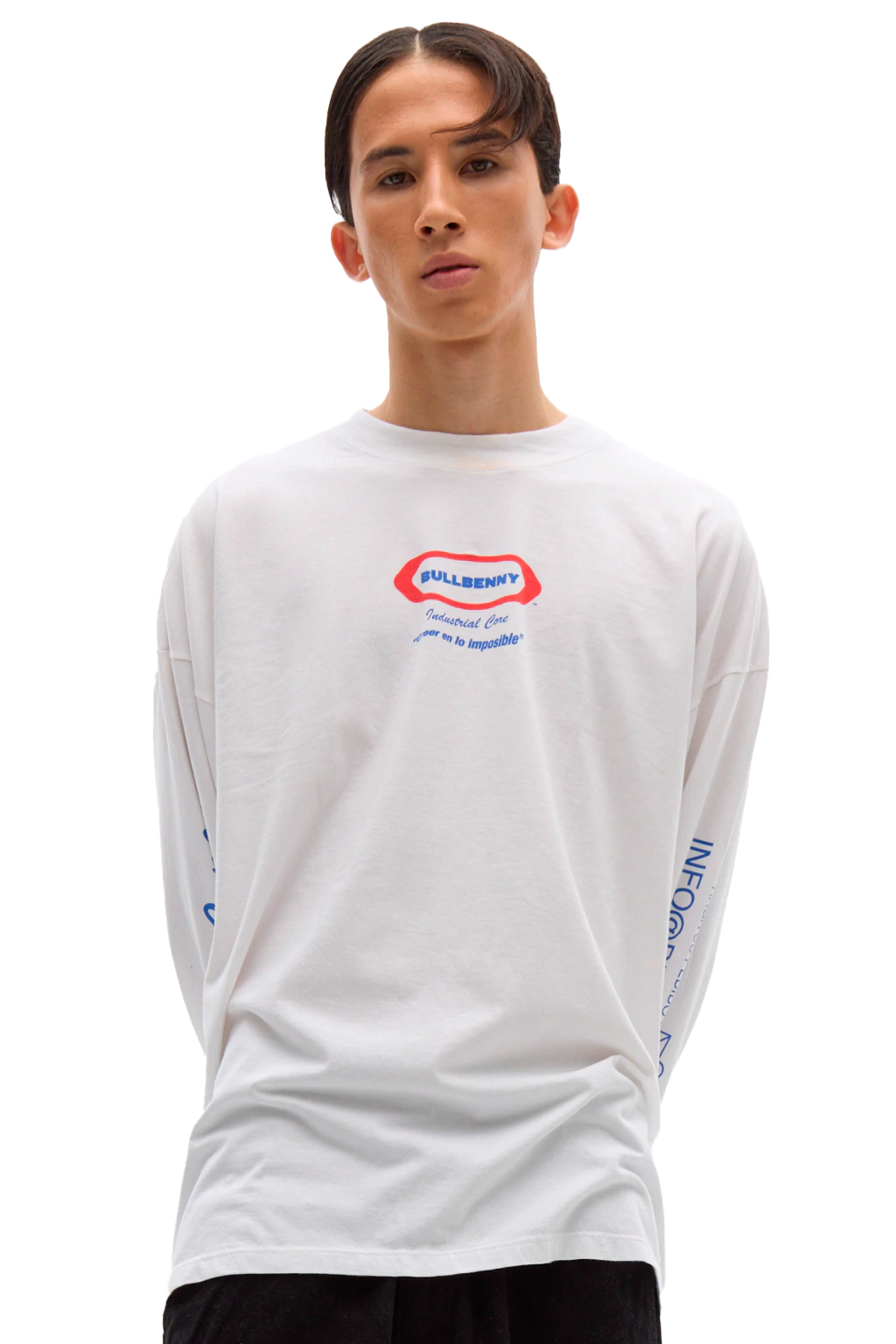 Available sizes: 1 / 2 / 3 / 4 - White — 100% Cotton oversized long sleeve t-shirt. Regular fit with prints on the sleeves. Kalani is 186 cm tall and wears it in size 4. Justina is 174 cm tall and wears it in size 3